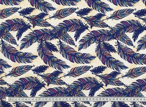 Champagne nepočesaná teplákovina s očky z rubní strany, motiv barevné pírka. Složení teplákoviny 90% bavlna, 10% elastan. Šířka metráže 175 cm. Látka je příjemná na omak i nošení. Teplákovina je vhodná na mikiny, tepláky, vesty.